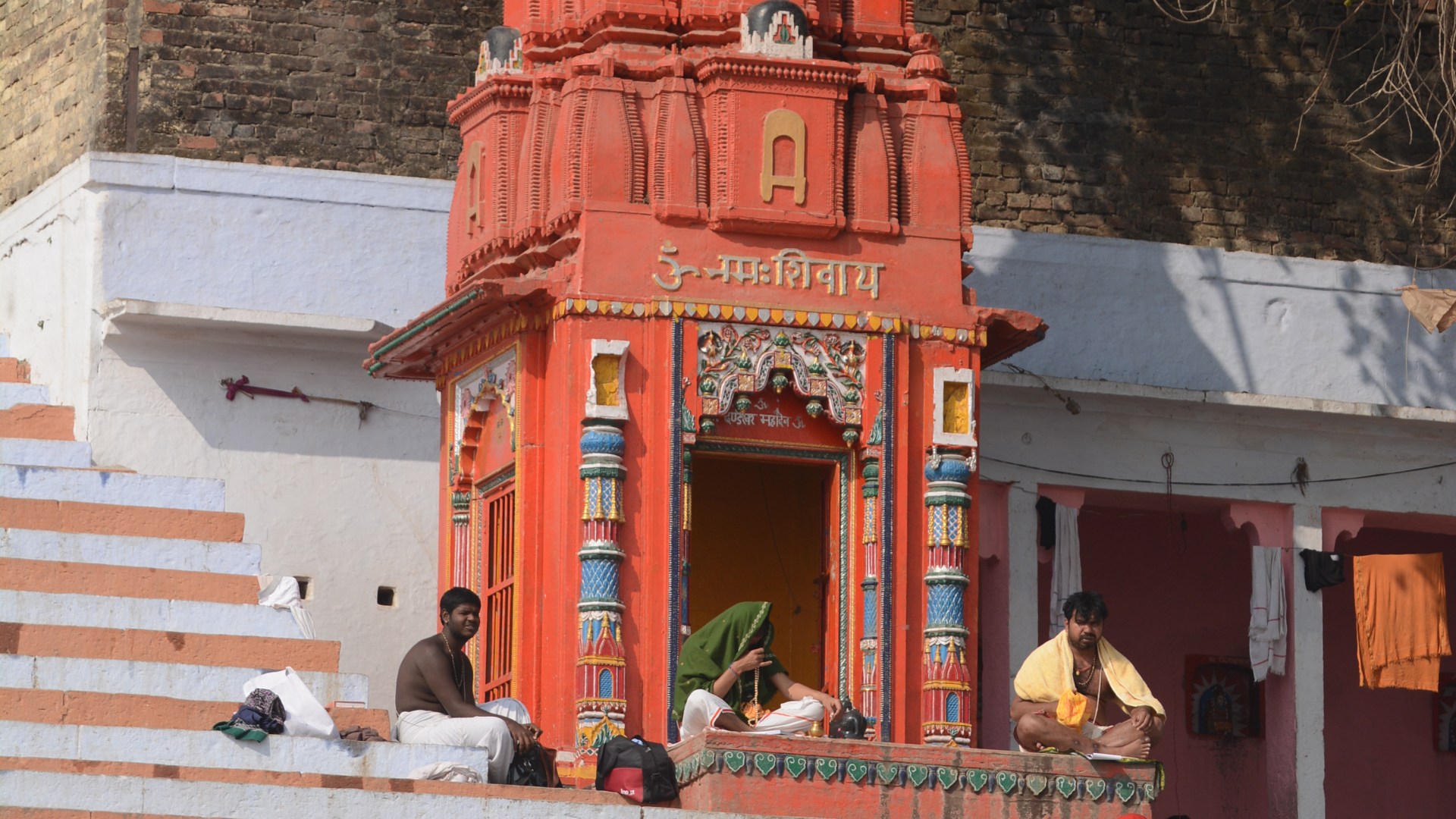 This scene is on the west bank of the Ganges River in Varanasi, India. I took the picture on my first mission trip to India with Reach the Rest Ministries. The little building is a Hindu shrine. It is a beautiful picture with the bright colors, curious dog buddies, and the man under the orange scarf sitting on the concrete block with the lunch bucket nearby.