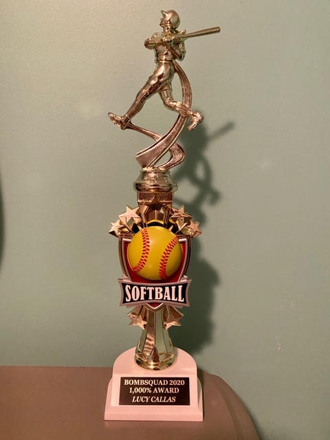 After this final game, Lucy was awarded a unique trophy, the “1,000% Award.” It was the first award of this type given in this league. I have never heard of it before this morning. The Bomber’s coaches gave her the award because Lucy never complained, always worked on identified weaknesses and improved with their instruction, and always ran on and off the field. I would guess her bat helped some.