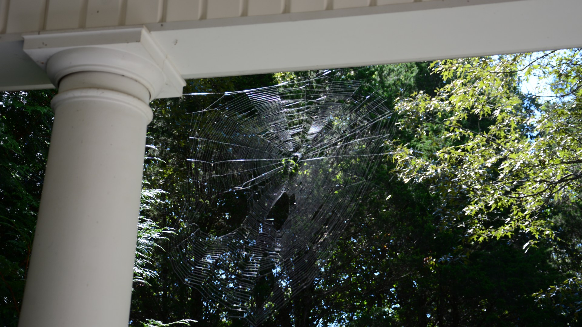 I looked where he was pointing, but I saw nothing. All I saw was the porch, trees, and the blue sky beyond. He motioned toward the web, a place that has been the hunting grounds for several generations of a very industrious spider clan. My friend said something like, “That is an incredibly large spider web.”