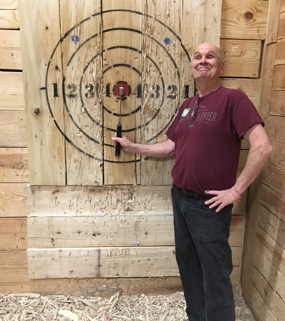Throwing an axe is not like throwing a knife. At the axe-throwing range, the staff has taken most of the learning curve out of successfully sticking the axe in the target wall. The employee working with us said, “Put your toe on this mark. Take the axe in both hands. Raise it behind your head, and then just throw it.” It worked! The axe rotates the correct number of times, and almost always, some portion of the sharp part hits the wood target wall. Change where you put your foot, and you are on your own discovering the mechanics of your “personal” choice of foot placement.