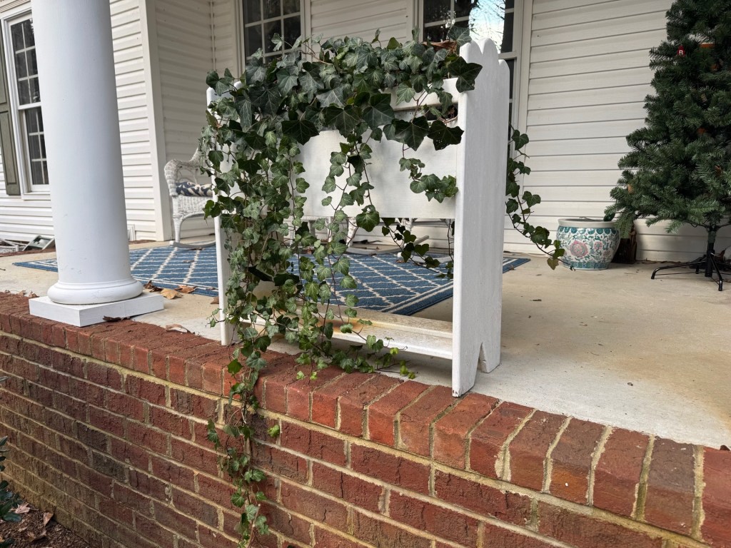 Photo – My ivy! Yes, that is a Christmas tree on the right side. Several months have passed since this post’s writing. I usually wait until sustained freezing temperatures are forecasted before moving the Ivy.